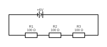 In this example we connect 3 resistors (each 100Ω) in a straight line with a 6Volt battery pack. This type of configuration is called an “in Series circuit”.